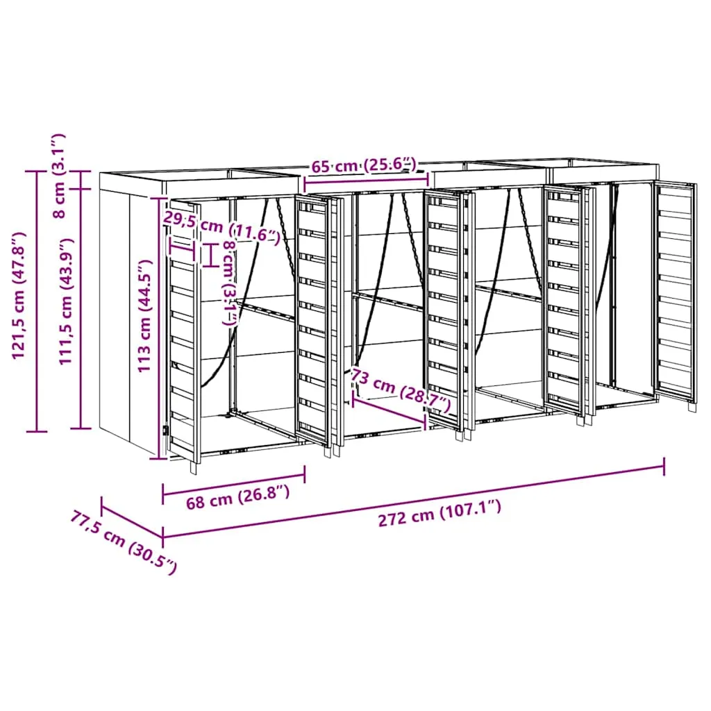 Fiecare compartiment este generos dimensionat pentru a găzdui containerele standard de 120L sau 240L, iar ușile magnetice oferă acces rapid și convenabil. Acoperișul integrat protejează containerele de ploaie și zăpadă, prelungindu-le durata de viață.