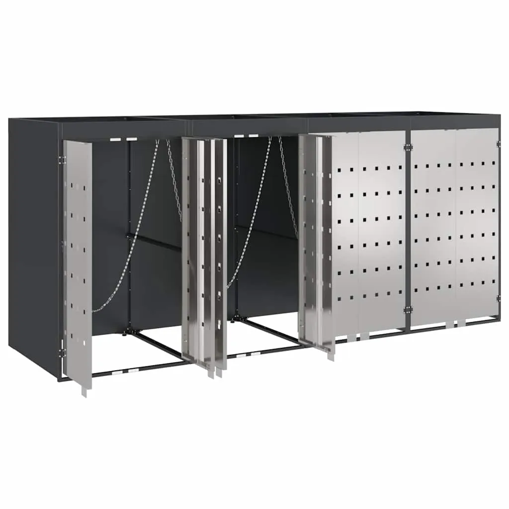 Transformă-ți spațiul exterior într-un mediu organizat și estetic cu acest depozit modern pentru 3 pubele wheelie. Designul antracit se integrează perfect în orice grădină sau terasă, oferind o soluție practică pentru gestionarea deșeurilor.
