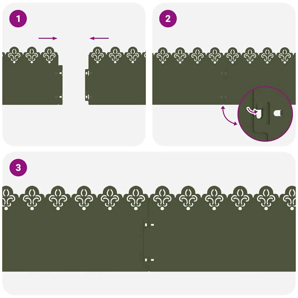 Acest set de 20 borduri din metal îți oferă soluția perfectă pentru a organiza și delimita spațiile din grădină. Culoarea verde măsliniu se integrează armonios în peisaj, creând o tranziție elegantă între gazon și alei sau între gazon și paturile de flori.