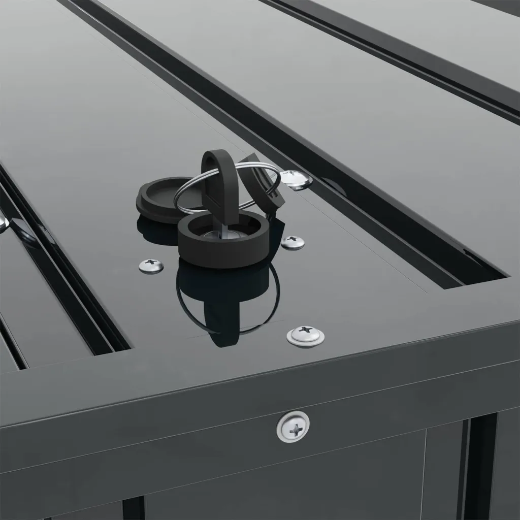 Fabricată din oțel de înaltă calitate, această cutie de depozitare oferă rezistență și durabilitate excepțională în fața condițiilor meteorologice. Materialul este special conceput pentru a rezista la uzură, asigurând o lungă durată de viață în mediul exterior.
