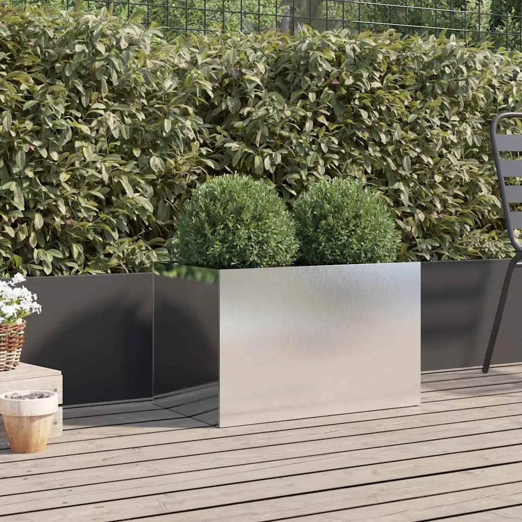 Această jardinieră din oțel inoxidabil argintiu aduce un plus de stil și funcționalitate în grădină, pe balcon sau terasă. Cu dimensiuni generoase, este perfectă pentru a expune plantațiile tale preferate într-un cadru modern și rezistent.