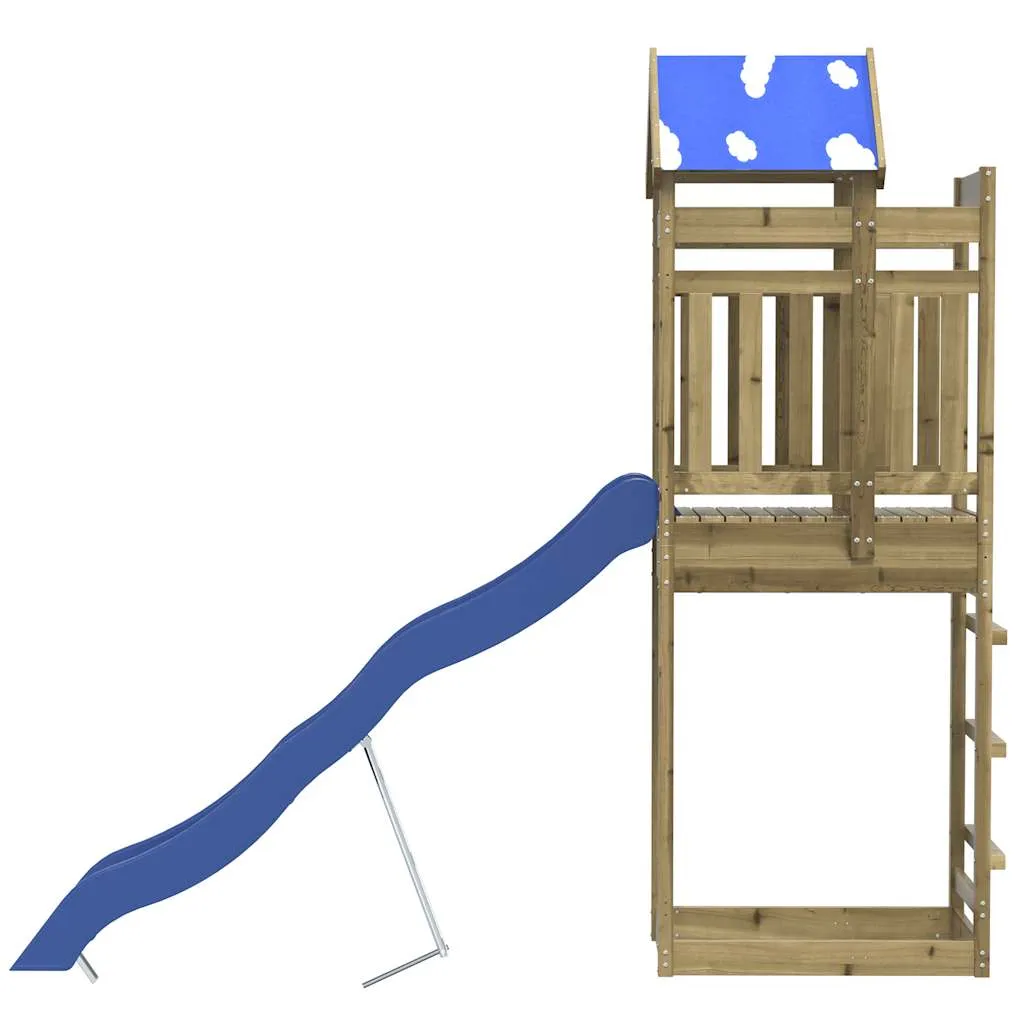 Platforma principală situată la 118 cm înălțime oferă o perspectivă excelentă asupra zonei de joacă. Balustradele din lemn din jurul platformei asigură siguranța copiilor în timp ce se joacă. Acoperișul din poliester cu design de nori nu doar că adaugă un element estetic plăcut, dar oferă și umbră necesară în zilele toride de vară.