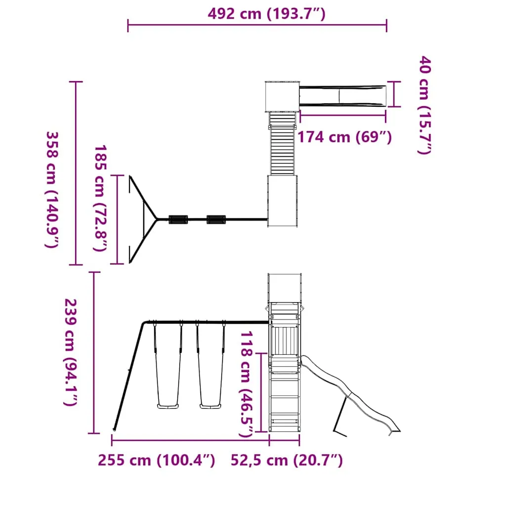 Cadrul robust și picioarele în formă de „A” oferă stabilitate maximă, în timp ce balustradele din lemn asigură protecție completă în timpul jocurilor. Platforma principală situată la 118 cm înălțime permite supraveghere ușoară, iar designul inteligent minimizează riscurile de accidentare.